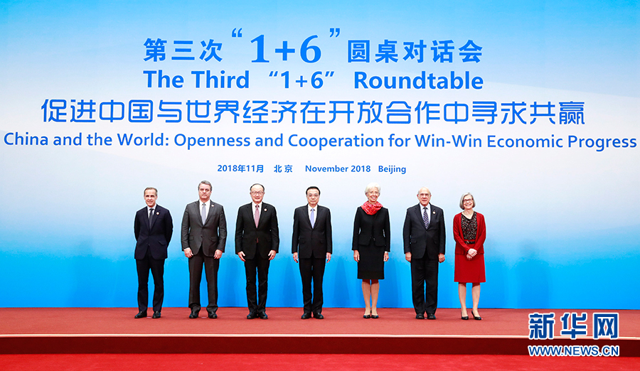 新華社北京11月6日電(記者鄭明達)國務院總理李克強6日下午在釣魚臺國賓館同世界銀行行長金墉、國際貨幣基金組織總裁拉加德、世界貿易組織總干事阿澤維多、經濟合作與發(fā)展組織秘書長古里亞、金融穩(wěn)定理事會主席卡尼和國際勞工組織副總干事格林菲爾德舉行第三次“1+6”圓桌對話會。會議圍繞“促進中國與世界經濟在開放合作中尋求共贏”的主題,就中國經濟和改革開放等議題深入交流。