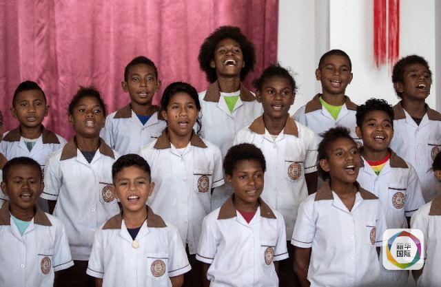 2018年11月13日,巴布亞新幾內(nèi)亞首都莫爾茲比港。孩子們?yōu)闅g迎出席中國-巴新友誼學(xué)校·布圖卡學(xué)園啟用儀式的習近平主席精心排練歌曲《茉莉花》。(新華社記者費茂華攝)