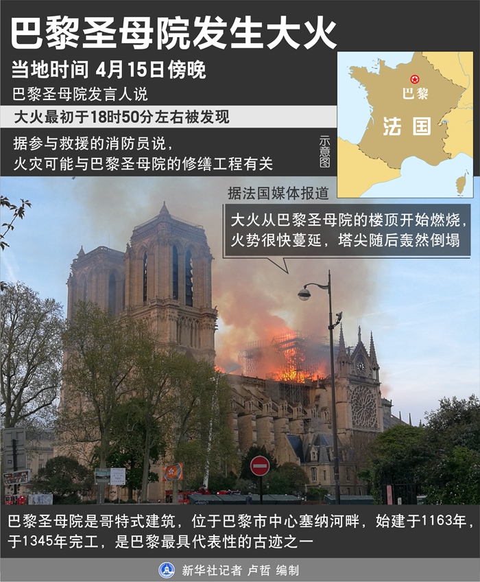 新華社巴黎4月15日電(記者唐霽 徐永春)位于法國首都的巴黎圣母院15日傍晚發(fā)生大火,造成巴黎圣母院塔尖倒塌,建筑損毀嚴(yán)重。目前尚無人員傷亡的報告。