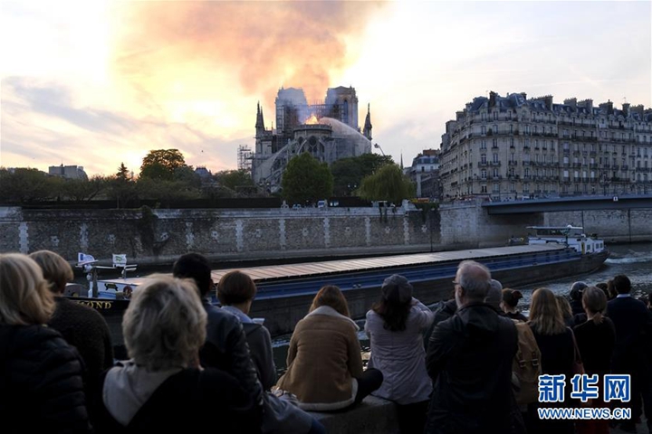 4月15日,在法國(guó)巴黎,人們圍觀著火的巴黎圣母院。新華社發(fā)(亞歷山大·卡曼 攝)