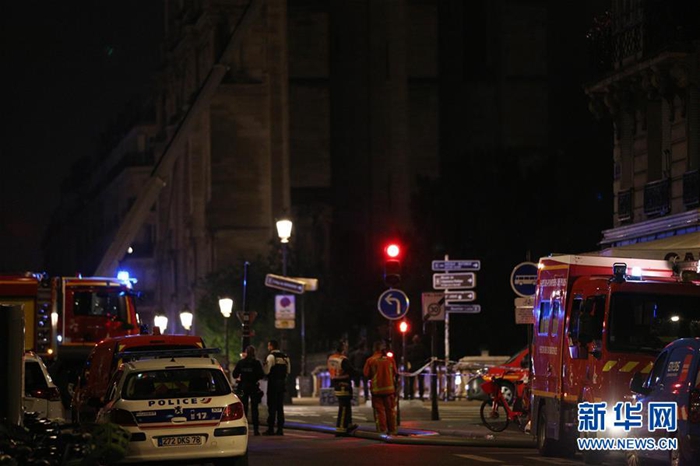 4月15日,在法國(guó)巴黎,警車和消防車??吭诎屠枋ツ冈号浴P氯A社記者 高靜 攝