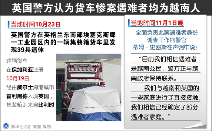 新華社倫敦11月1日電(記者張代蕾)英國埃塞克斯郡警方11月1日晚發(fā)表聲明說,警方目前認為上月發(fā)生的貨車慘案39名遇難者均為越南人。
