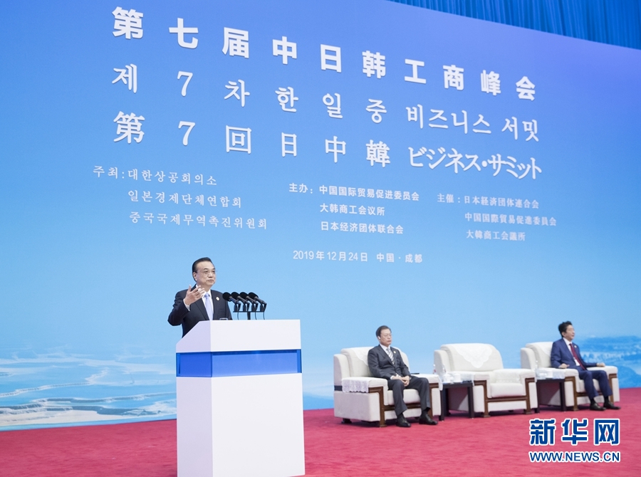12月24日,國務(wù)院總理李克強(qiáng)在四川成都與韓國總統(tǒng)文在寅、日本首相安倍晉三共同出席第七屆中日韓工商峰會并致辭。 新華社記者 王曄 攝