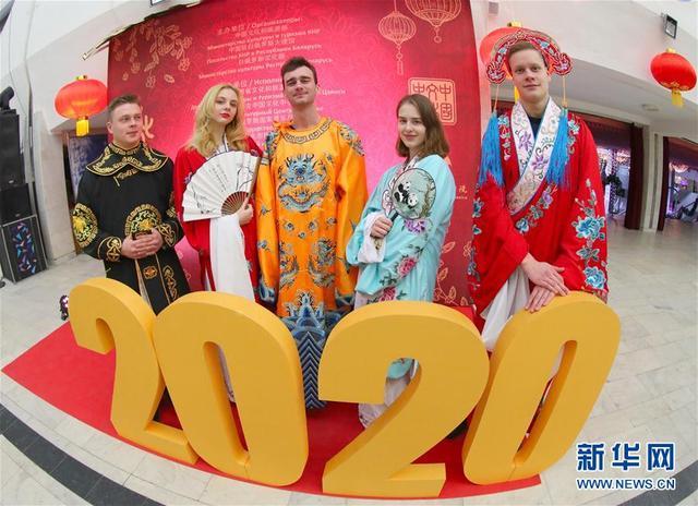 1月16日,在白俄羅斯首都明斯克,身著中國(guó)戲服的白俄羅斯人合影留念。 新華社發(fā)(任科夫攝)