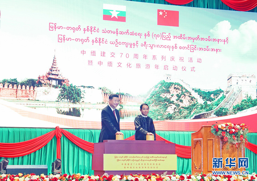 當(dāng)?shù)貢r(shí)間1月17日晚,國(guó)家主席習(xí)近平在內(nèi)比都第二國(guó)際會(huì)議中心出席中緬建交70周年慶?;顒?dòng)暨中緬文化旅游年啟動(dòng)儀式。這是習(xí)近平和緬甸總統(tǒng)溫敏共同按下按鈕,正式啟動(dòng)中緬文化旅游年。 新華社記者 鞠鵬 攝