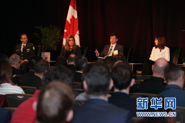 圖為中國駐加拿大大使叢培武(右二)在渥太華安全與防務(wù)會議上回答問題。記者李保東 攝
