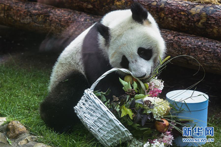 資料圖片:2019年7月31日,在俄羅斯首都莫斯科,大熊貓“如意”享用工作人員為它準(zhǔn)備的“生日蛋糕”。新華社記者 白雪騏 攝