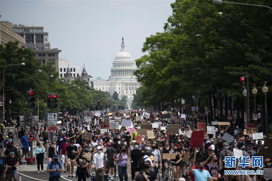 6月6日,人們?cè)诿绹A盛頓國會(huì)附近游行。美國首都迎來了十幾天來參與人數(shù)最多的游行活動(dòng)。新華社記者 劉杰 攝