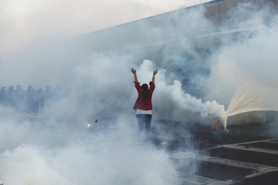 5月30日晚,在美國明尼蘇達(dá)州明尼阿波利斯市,抗議者在防暴警察施放的催淚瓦斯中與警察對(duì)峙。新華社發(fā)(安格斯·亞歷山大攝)