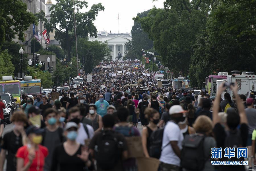 6月6日,人們?cè)诿绹A盛頓白宮附近游行。美國首都迎來了十幾天來參與人數(shù)最多的游行活動(dòng)。新華社記者 劉杰 攝
