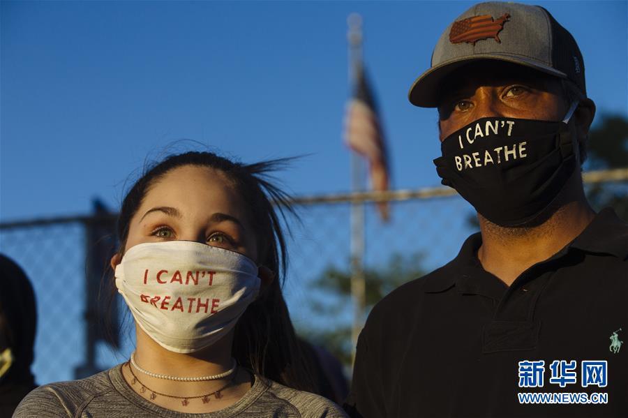 5月30日晚,在美國明尼蘇達(dá)州明尼阿波利斯市,抗議者面戴寫有“我無法呼吸”的口罩,參加抗議活動(dòng)。新華社發(fā)(安格斯·亞歷山大攝)