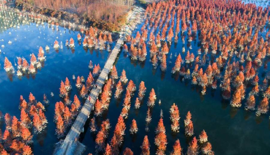 云南昆明水杉濕地冬日一景(2019年1月5日攝,無人機(jī)照片)。新華社記者 秦晴 攝