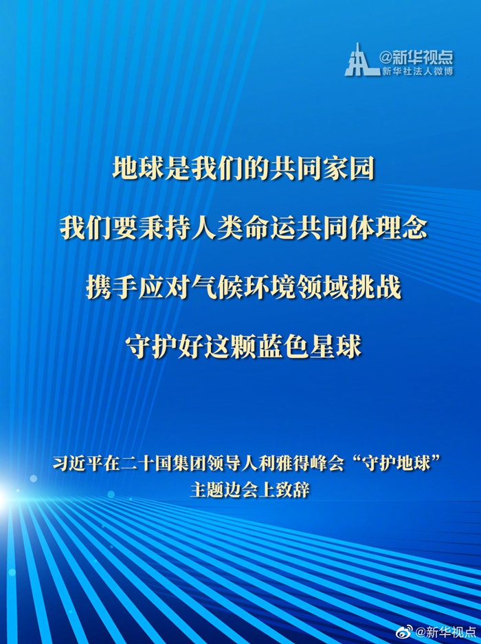 國家主席習近平11月22日在二十國集團領(lǐng)導(dǎo)人利雅得峰會“守護地球”主題邊會上致辭時表示,地球是我們的共同家園。我們要秉持人類命運共同體理念,攜手應(yīng)對氣候環(huán)境領(lǐng)域挑戰(zhàn),守護好這顆藍色星球。