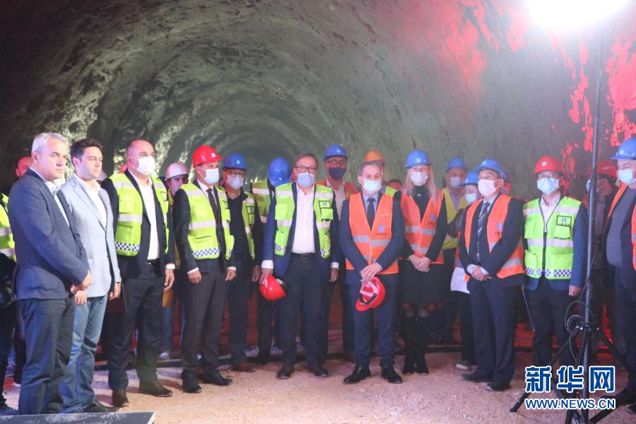 10月21日,在波黑泛歐5C走廊高速公路波契泰利隧道,中國(guó)施工方與波黑政府及業(yè)主方在隧道貫通后合影留念。新華社發(fā)(中建公司供圖)