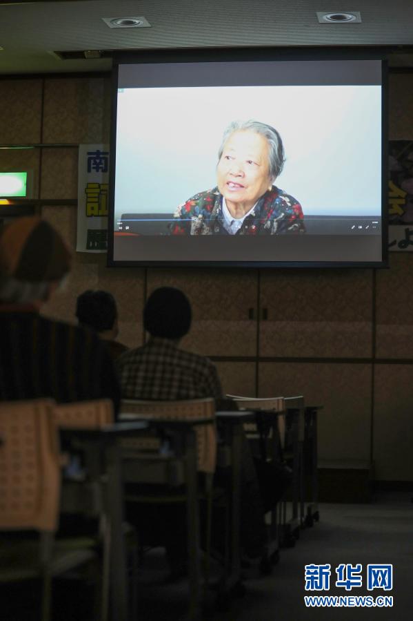 12月13日,人們在日本東京舉行的紀念南京大屠殺83周年集會現(xiàn)場觀看南京大屠殺幸存者石秀英的講述紀錄片。新華社記者 杜瀟逸 攝