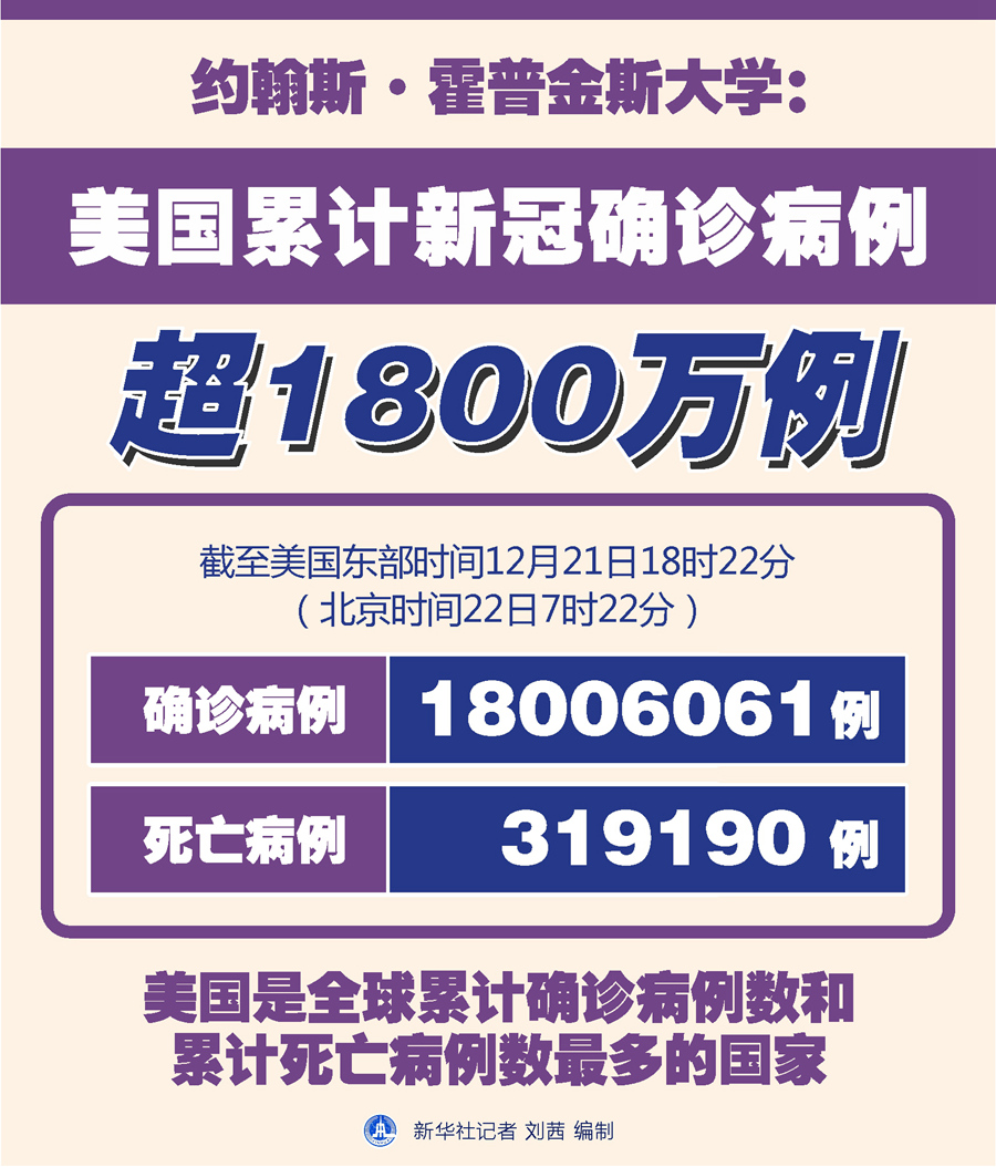 新華社紐約12月21日電 美國約翰斯·霍普金斯大學(xué)21日發(fā)布的新冠疫情最新統(tǒng)計數(shù)據(jù)顯示,美國累計確診病例超過1800萬例。