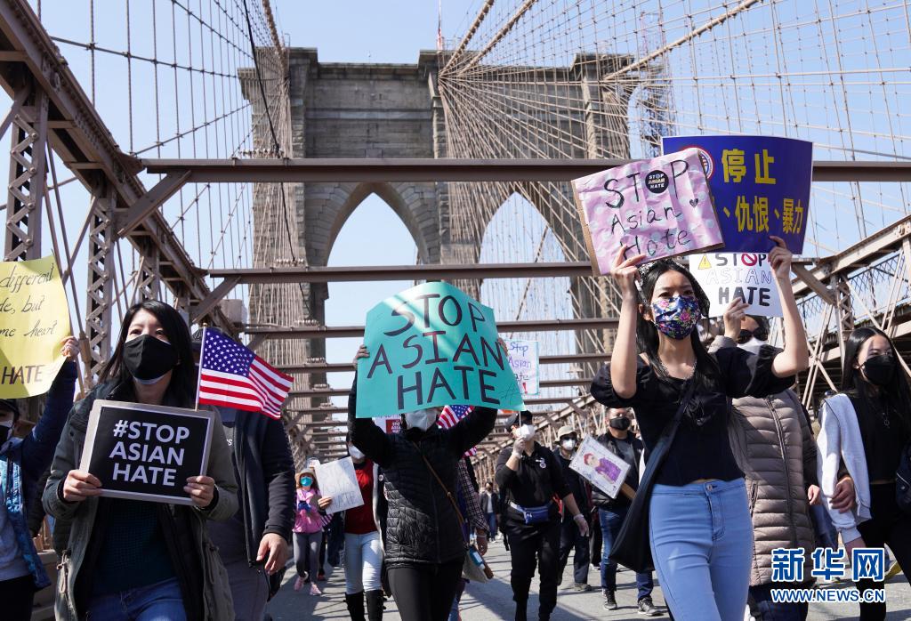 2021年4月4日,反對(duì)亞裔仇恨的游行隊(duì)伍走過(guò)美國(guó)紐約的布魯克林大橋。2020年以來(lái),由于少數(shù)美國(guó)政客借疫情污名化亞裔,致使針對(duì)亞裔的種族歧視和仇恨犯罪不斷升級(jí)。 新華社記者 王迎 攝