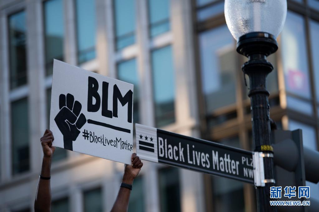 2020年6月8日,一名示威者在美國(guó)華盛頓白宮附近高舉“黑人的命也是命”的標(biāo)語(yǔ)。 新華社記者 劉杰 攝