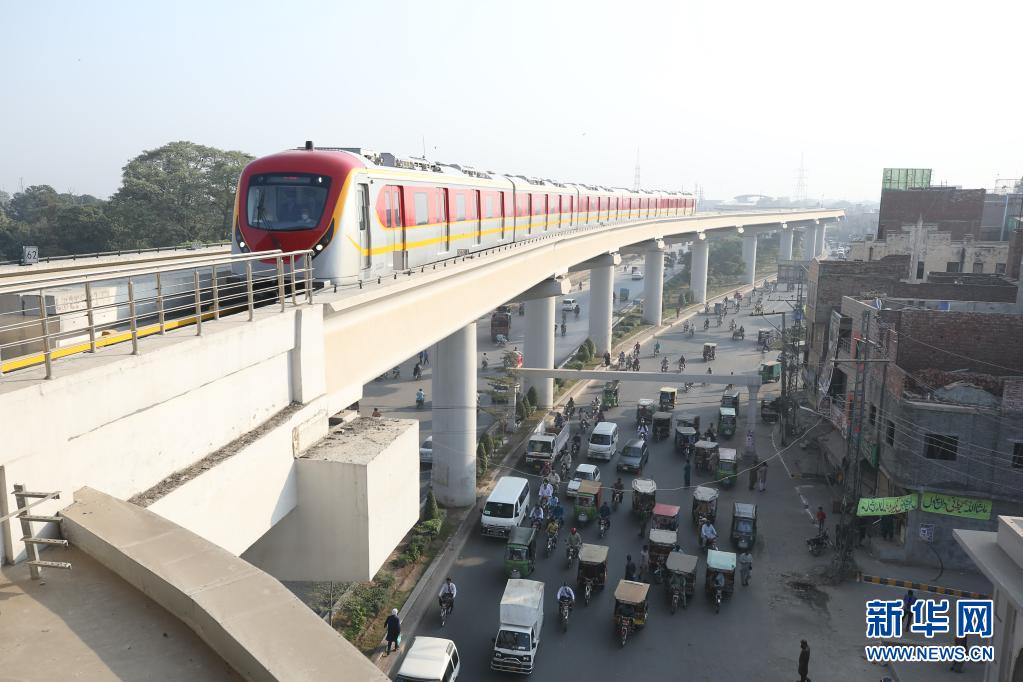 在巴基斯坦拉合爾市,一輛橙線地鐵列車(chē)準(zhǔn)備進(jìn)站(2020年10月26日攝)。當(dāng)日,巴基斯坦首條地鐵——拉合爾橙線迎來(lái)首批乘客,標(biāo)志著巴基斯坦步入“地鐵時(shí)代”。新華社記者劉天攝