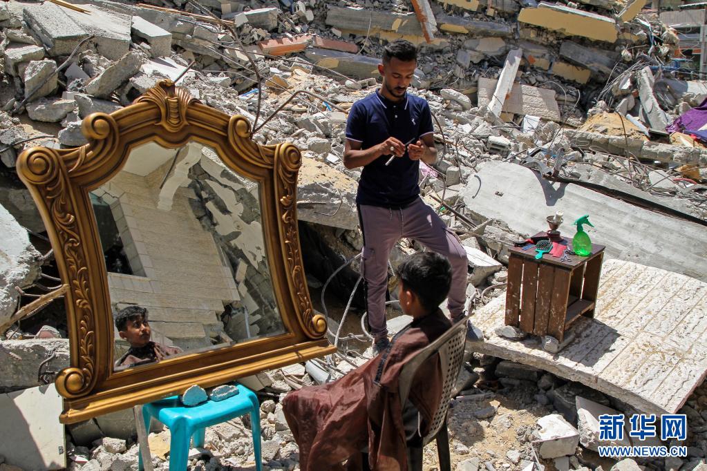 5月26日,在加沙地帶北部的城鎮(zhèn)貝特拉希亞,23歲的巴勒斯坦理發(fā)師阿卜杜拉·扎瓦拉在他被以色列炸毀的房屋前為顧客免費(fèi)服務(wù)。 新華社發(fā)(里澤克·阿卜杜勒·賈瓦德攝)