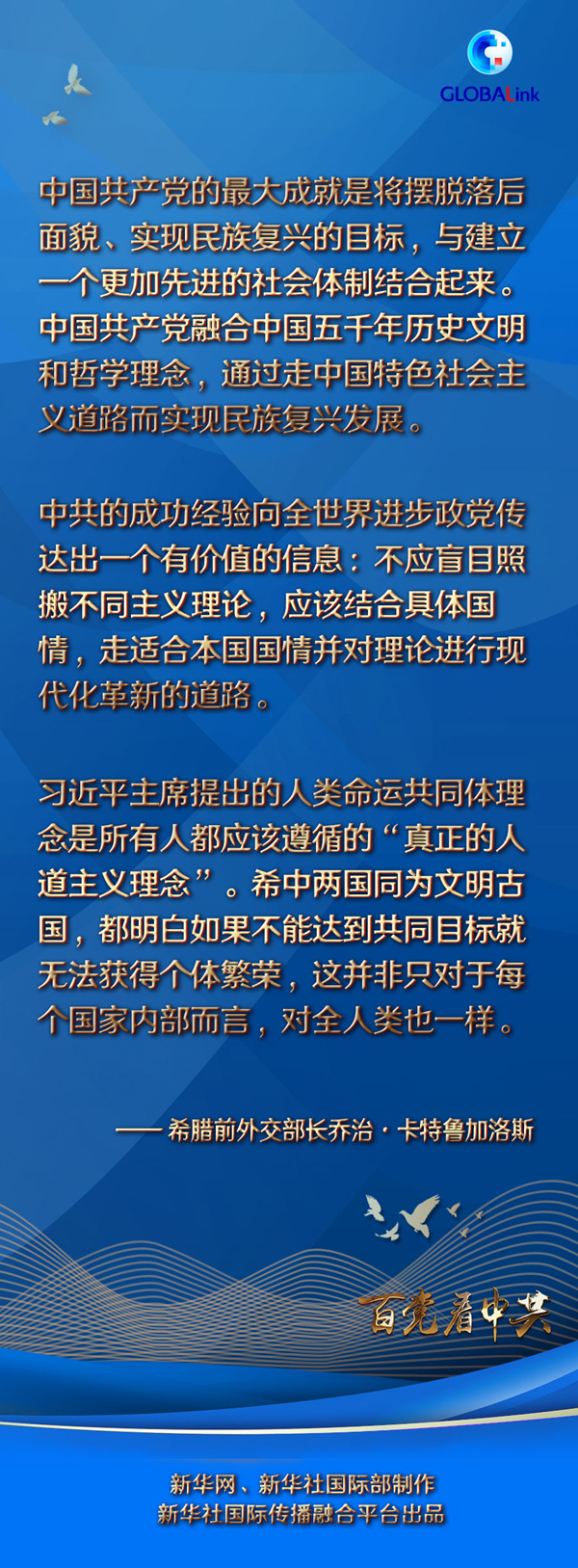 在中共百年華誕之際,卡特魯加洛斯向中國(guó)共產(chǎn)黨和中國(guó)人民送上祝福:“我相信中國(guó)人民取得的這些矚目成就還將繼續(xù)下去,相信中國(guó)共產(chǎn)黨的下一個(gè)百年能給中國(guó)人民帶來更加光明和美好的未來。”