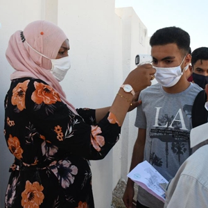 6月16日,工作人員在突尼斯首都突尼斯市一個(gè)考場(chǎng)外給準(zhǔn)備參加高等學(xué)校入學(xué)考試的學(xué)生測(cè)量體溫。