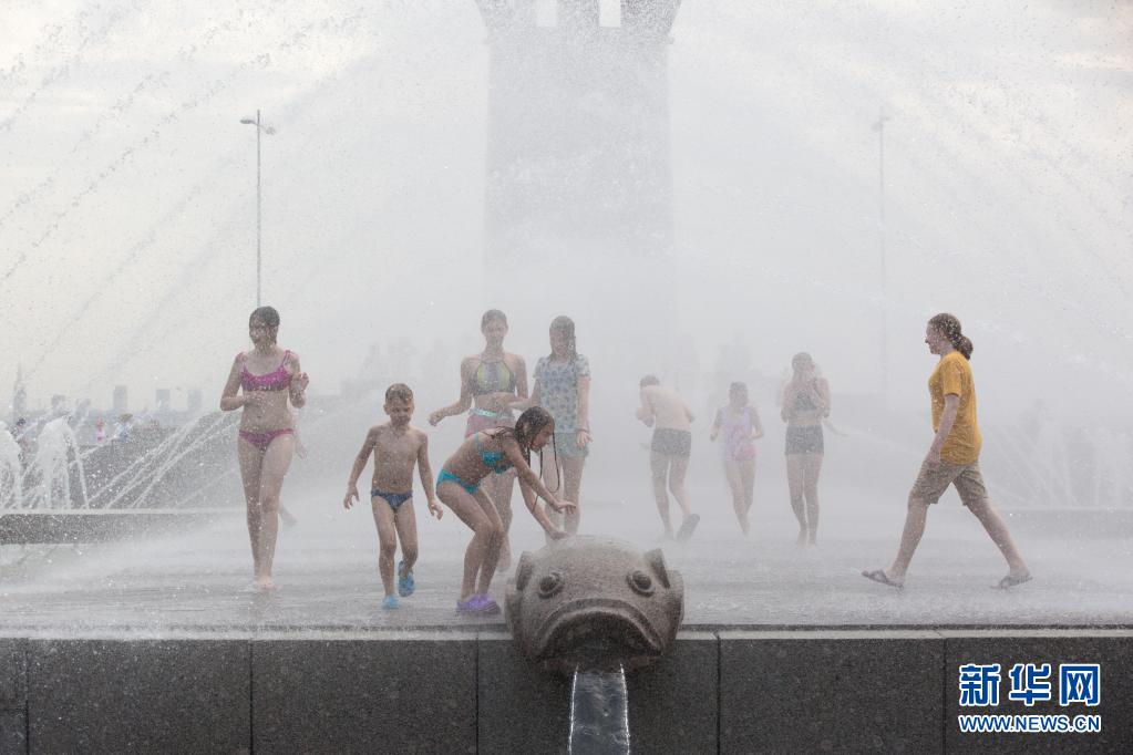 6月22日,孩子們?cè)诙砹_斯圣彼得堡300周年公園戲水消暑。
